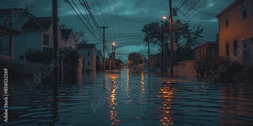 © Mark G, Fototapeta premium A photo of a post-apocalyptic cityscape with water, trees and debris on the streets. This illustrates the concept of environmental catastrophe, floods, climate emergency, and global warming.