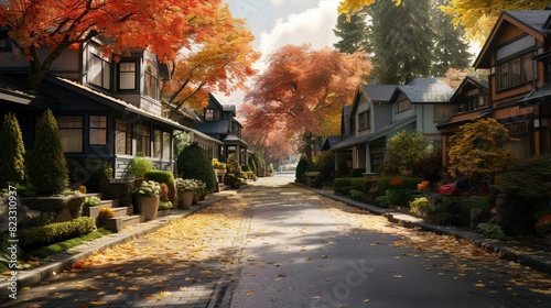 © Global Stock, Naklejka premium A photo of a residential street with autumn foliage.