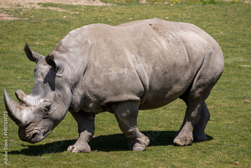 © Géza, Fototapeta premium A photo of a rhino is walking in the grass