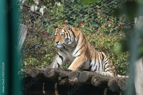 © Géza, Obraz premium A photo of a tiger sitting on a log