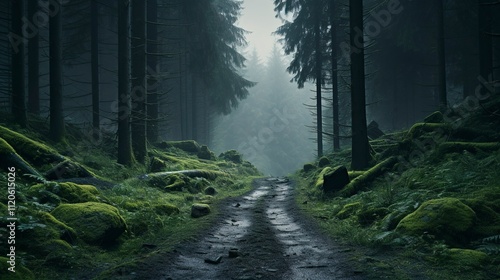 © Magic Stock, Fototapeta premium A photo of a trail leading into a misty forest.