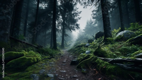 © Magic Stock, Obraz premium A photo of a trail leading into a misty forest.