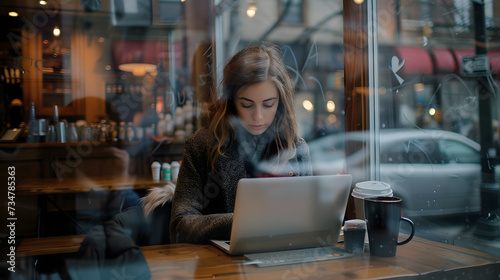 Fototapeta premium A photo of a woman working on her laptop in a coffee shop, reflected in a...