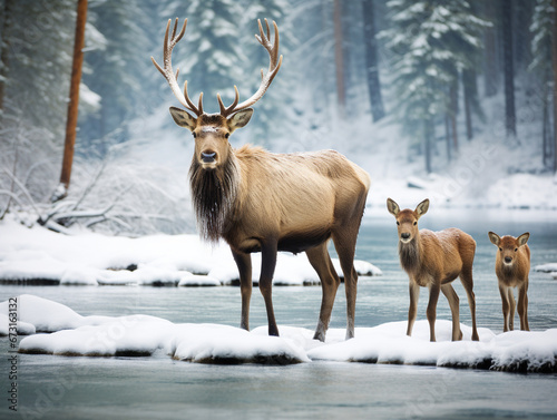 Fototapeta premium A Photo of an Elk and Her Babies in a Winter Setting