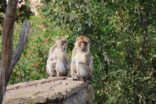 © Géza, Obraz premium A photo of two monkeys sitting on a rock