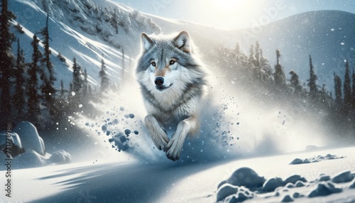 Naklejka premium A photo-realistic image of a wolf running through deep snow, capturing the motion and the power of its movement.