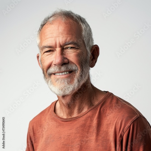 Obraz premium A photograph capturing a man with a white beard smiling wearing a brown shirt.