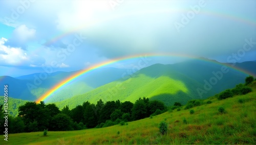 © Danish, Fototapeta premium A photograph of a vibrant, multi-colored rainbow arching over a lush, green valley with rolling hills. The sky is mostly cloudy, with patches of blue peeking through.
