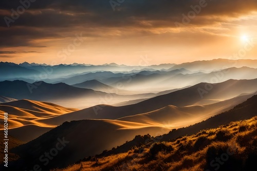 Fototapeta premium A Photograph of serene majesty: A vast expanse of mountains reaches towards the heavens, basking in the warm glow of a sun-kissed horizon.