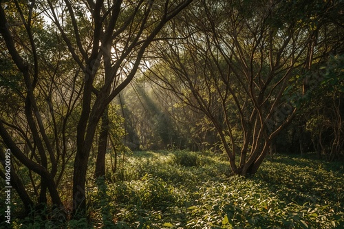 © The 2R Artificiality, Obraz premium A photograph showcasing the stunning effect of sunlight streaming through dense greenery in a tropical setting.
