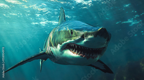 Fototapeta premium A photorealistic close-up of a great white shark underwater, surrounded by...