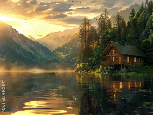 Fototapeta premium A photorealistic depiction of a serene lake house at sunset