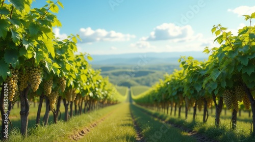 © Kristina, Naklejka premium A photorealistic image of lush grape vines growing in a vineyard, with clusters of ripe grapes hanging from the vines, set against a backdrop of rolling hills and a clear blue sky