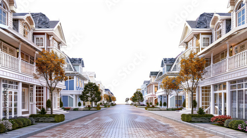 Naklejka premium A photorealistic street view of row houses on a brick road.