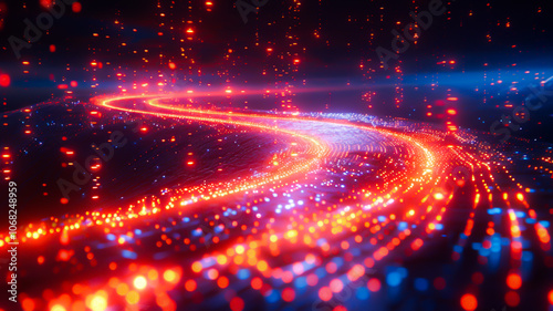 Obraz premium A photorealistic visualization of global internet connectivity with glowing data streams, network paths, fiber optics, speed metrics, and digital world map