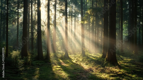 Fototapeta premium A photostock images of a forest with sunlight streaming through the trees