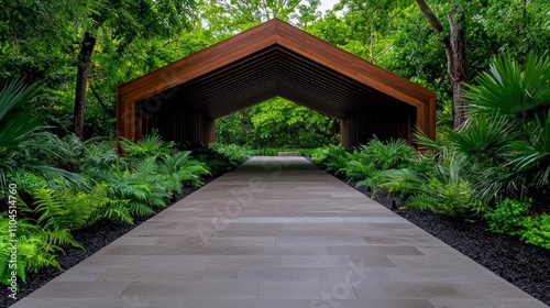 © Eakkarin, Fototapeta premium a photostock of a geometric pavilion in a public park surrounded by lush greenery, contemporary outdoor design 2025