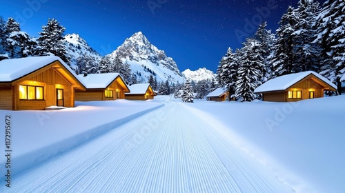Naklejka premium A photostock of a traditional snowy village with warmly lit cottages surrounded by tall pine trees under a clear starry winter sky, symbolizing tranquility. High Quality