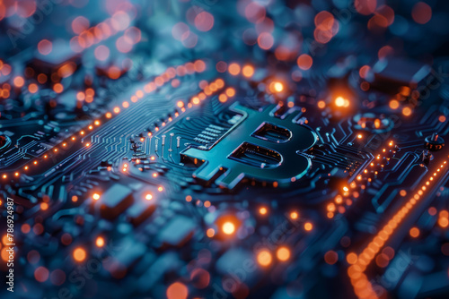 Fototapeta premium A physical Bitcoin coin on an illuminated electronic circuit board,...