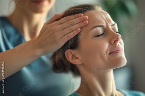 © CreativeLight, Fototapeta premium A physiotherapist demonstrating a head massage technique for relaxation and stress relief