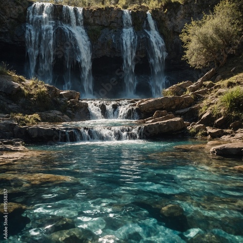 Naklejka premium A picnic at the edge of a sparkling waterfall cascading into a crystal-clear...
