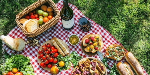 Fototapeta premium A picnic spread featuring fresh produce, bread, wine, and salads on a...