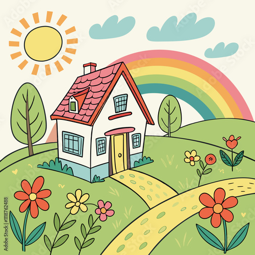 Fototapeta premium a picture of a house with a rainbow in the sky, a drawing of a house with a...