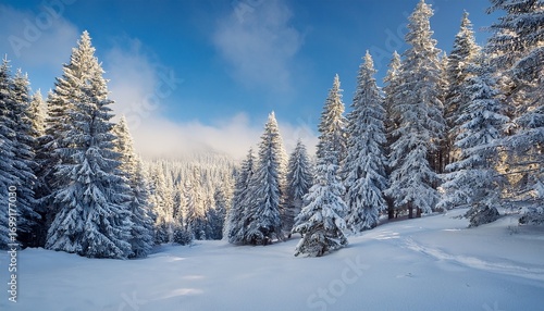 Naklejka premium a picture of a winter forest winter in the forest powder day on the mountain fresh snow on the trees