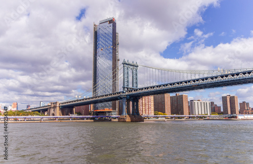 Naklejka premium A picture of Manhattan Bridge in New York City, USA. In the picture one can see the East River, One Manhattan Square and Manhattan skyline
