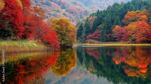 Naklejka premium A picturesque autumn scene with vibrant red, orange, and yellow trees surrounding the tranquil lake