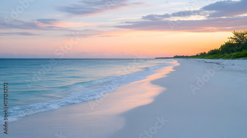 Fototapeta premium A picturesque beach scene at sunset showing calm waves rolling onto a sandy...