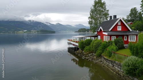 Fototapeta premium A picturesque cabin nestled in nature's tranquil embrace.