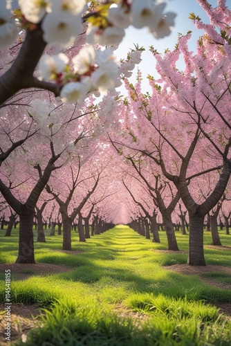 Naklejka premium A picturesque cherry orchard in full bloom during springtime, with rows of cherry trees covered in white and pink blossoms