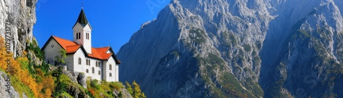 © Iswanto, Fototapeta premium A picturesque church nestled among majestic mountains under a clear blue sky.