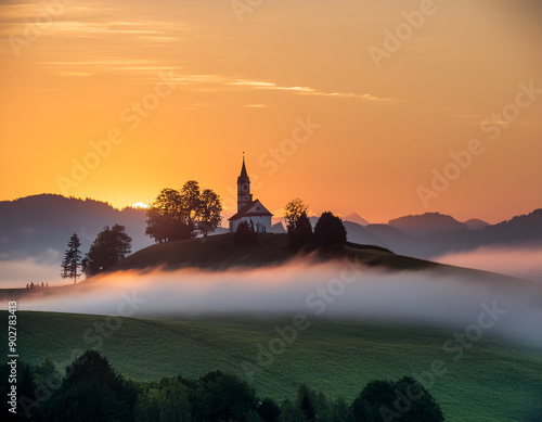 Fototapeta premium A picturesque church on a hill with a stunning sunrise and fog-covered valley...