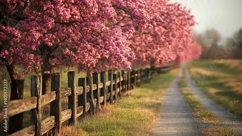 Fototapeta premium A picturesque country lane lined with blossoming pink trees and an old wooden fence.