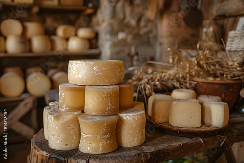 © Jack, Fototapeta premium A picturesque countryside landscape with a traditional cheese-making farm, aged to perfection in wooden cellars.