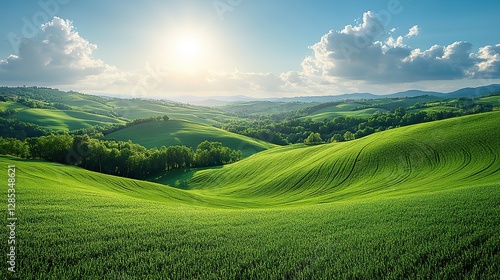 Fototapeta premium A picturesque countryside landscape with rolling hills, green fields, and a bright blue sky