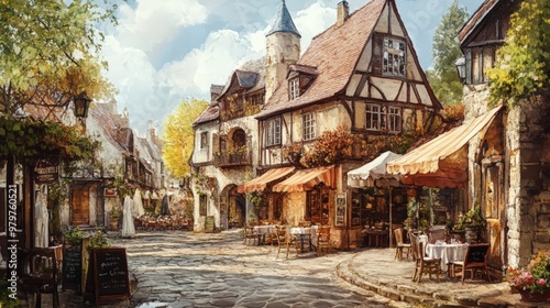 © Ali, Fototapeta premium A picturesque European street with cafes and charming buildings.