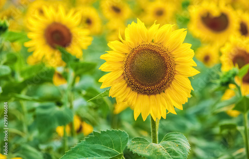 Fototapeta premium A picturesque field of a blossoming sunflower at sunset. Grain harvest in summer.