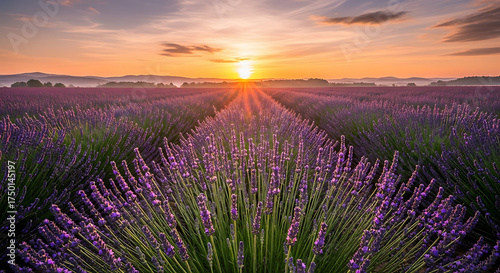 © Thiago, Fototapeta premium A picturesque field of lavender stretches towards the horizon at sunrise. The warm light of the sun bathes the scene in a soft glow, creating a serene and idyllic landscape.