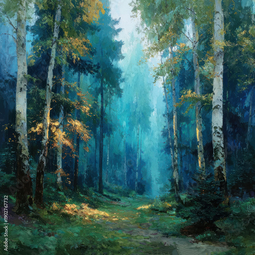© Evdoha, Obraz premium A picturesque forest landscape in cool turquoise and emerald tones.