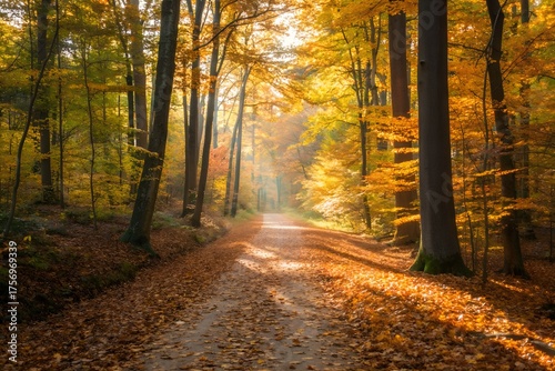 © Yauhen, Obraz premium A picturesque forest path blanketed with colorful autumn leaves, illuminated by warm sunlight streaming through trees, creating a serene and tranquil natural setting.