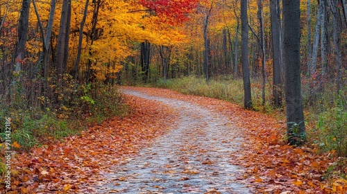 Naklejka premium A picturesque forest path covered in a blanket of autumn leaves. The trail winds through a canopy