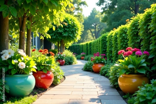 Naklejka premium A picturesque garden path meanders through vibrant, flourishing flowerbeds, showcasing a variety of colorful potted plants and lush green hedges in a sunlit landscape.