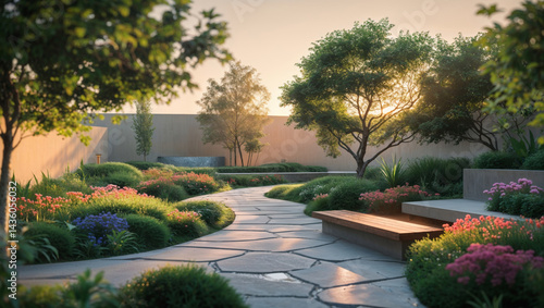 Fototapeta premium A picturesque garden scene with a stone pathway, flowers, and trees bathed in...
