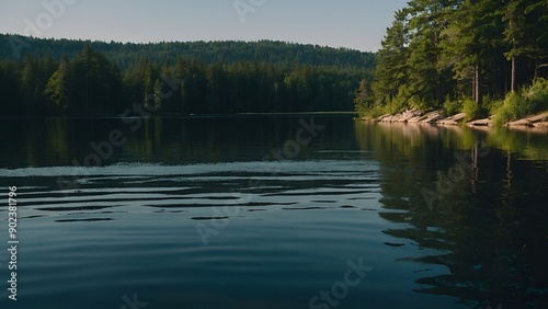 © Oleksandr, Naklejka premium A picturesque lake view with reflections of a serene winter dawn