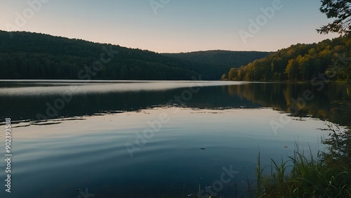 © Oleksandr, Fototapeta premium A picturesque lake view with reflections of a vibrant winter twilight