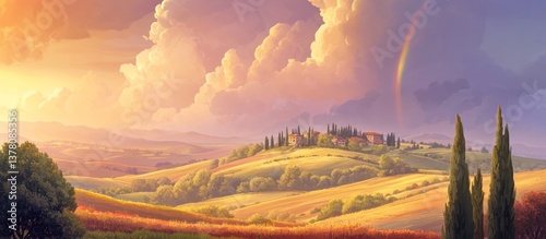 © hidayati, Obraz premium A picturesque landscape featuring a hillside village under a rainbow
