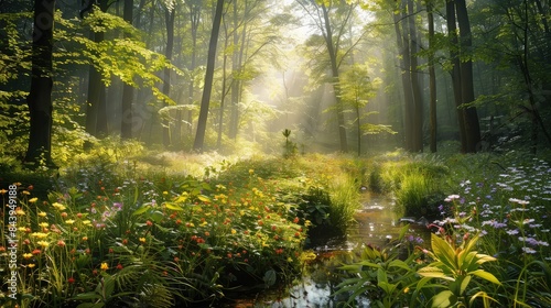 Fototapeta premium A picturesque morning in the forest with a clear blue sky visible through the...